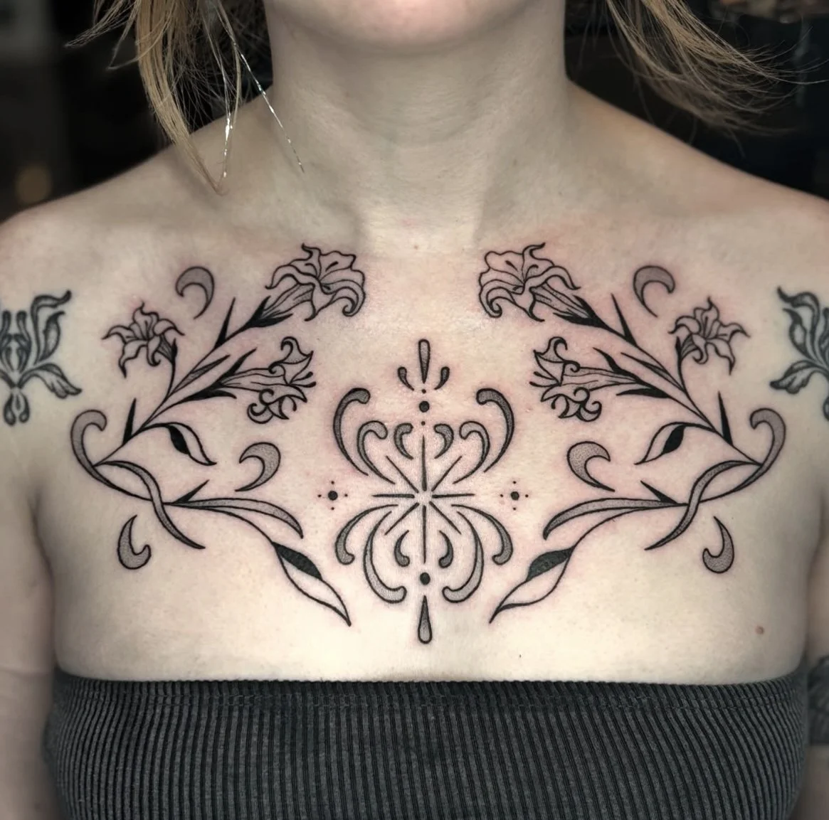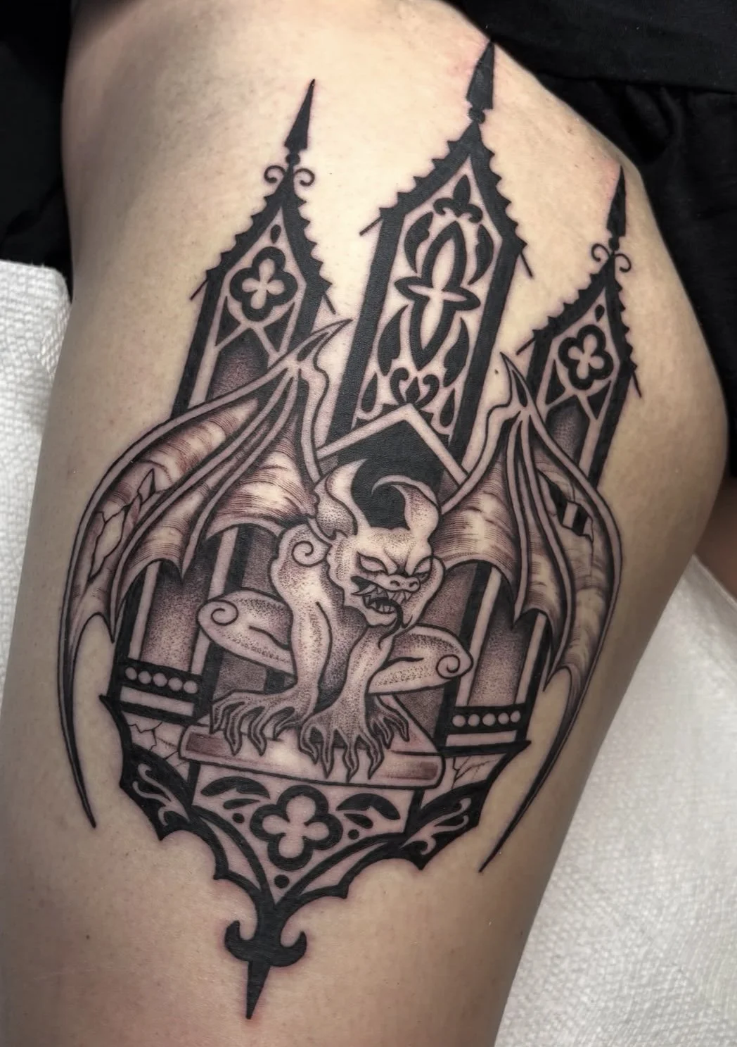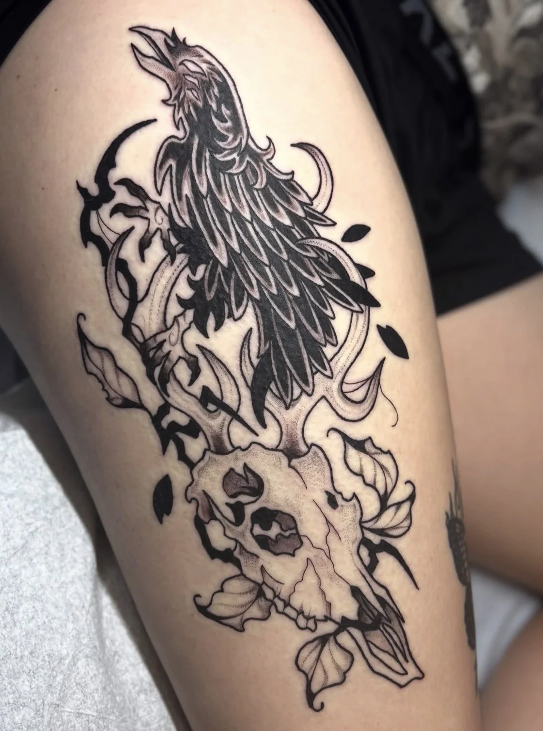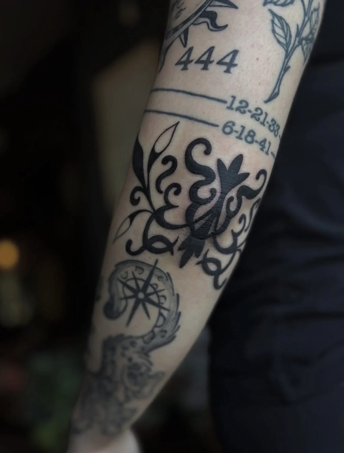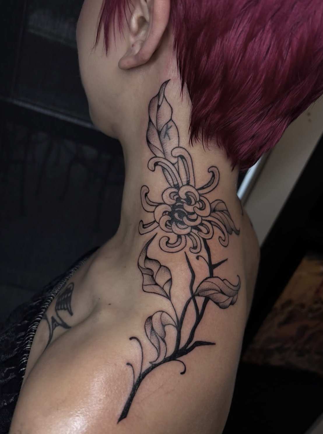 Jasmine specializes in illustrative black and grey tattoos and fine line work, with a focus on detail, contrast, and custom composition. Her favorite subject matter includes gothic and medieval imagery, botanicals, surrealism, and anime-inspired designs.