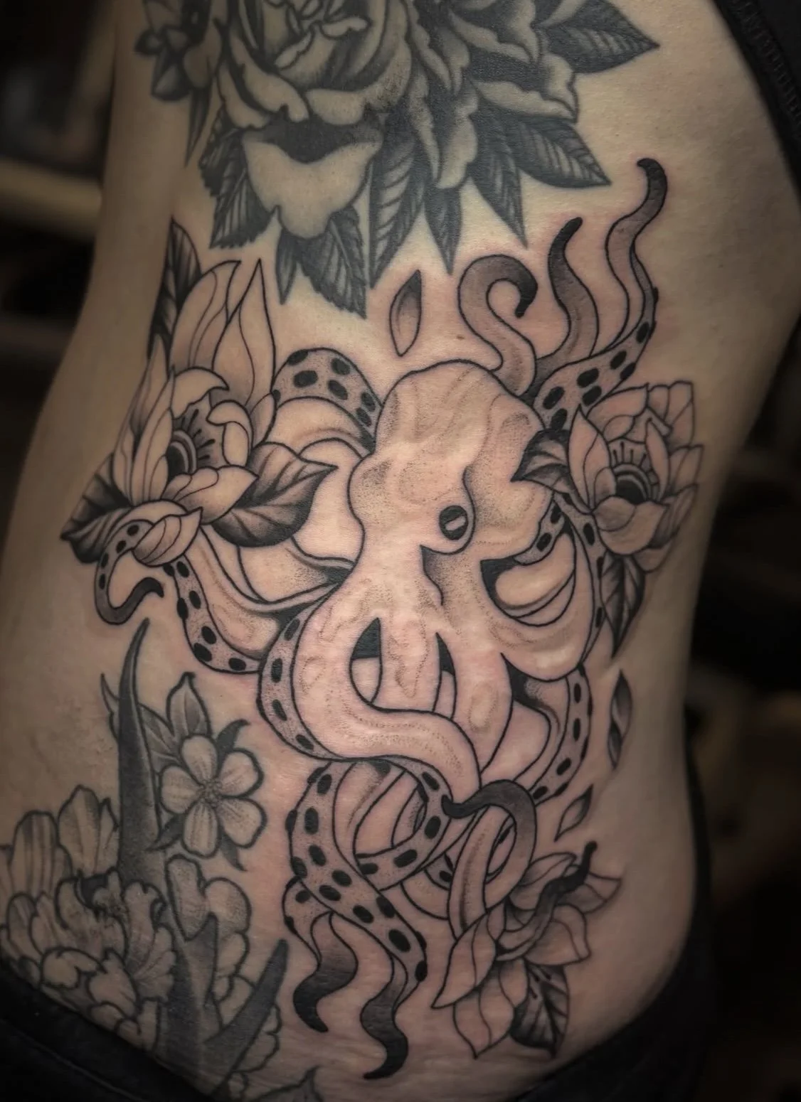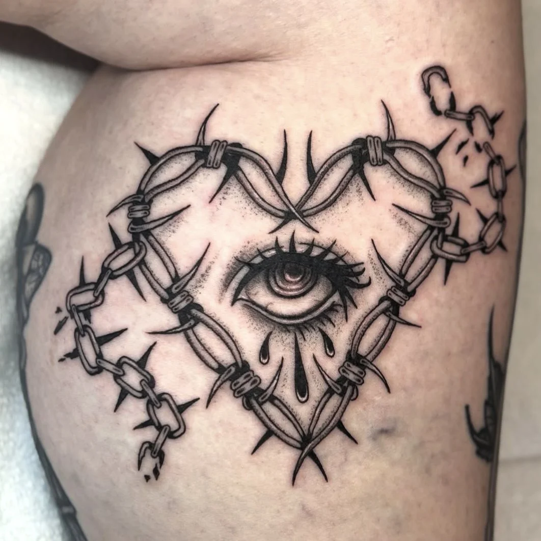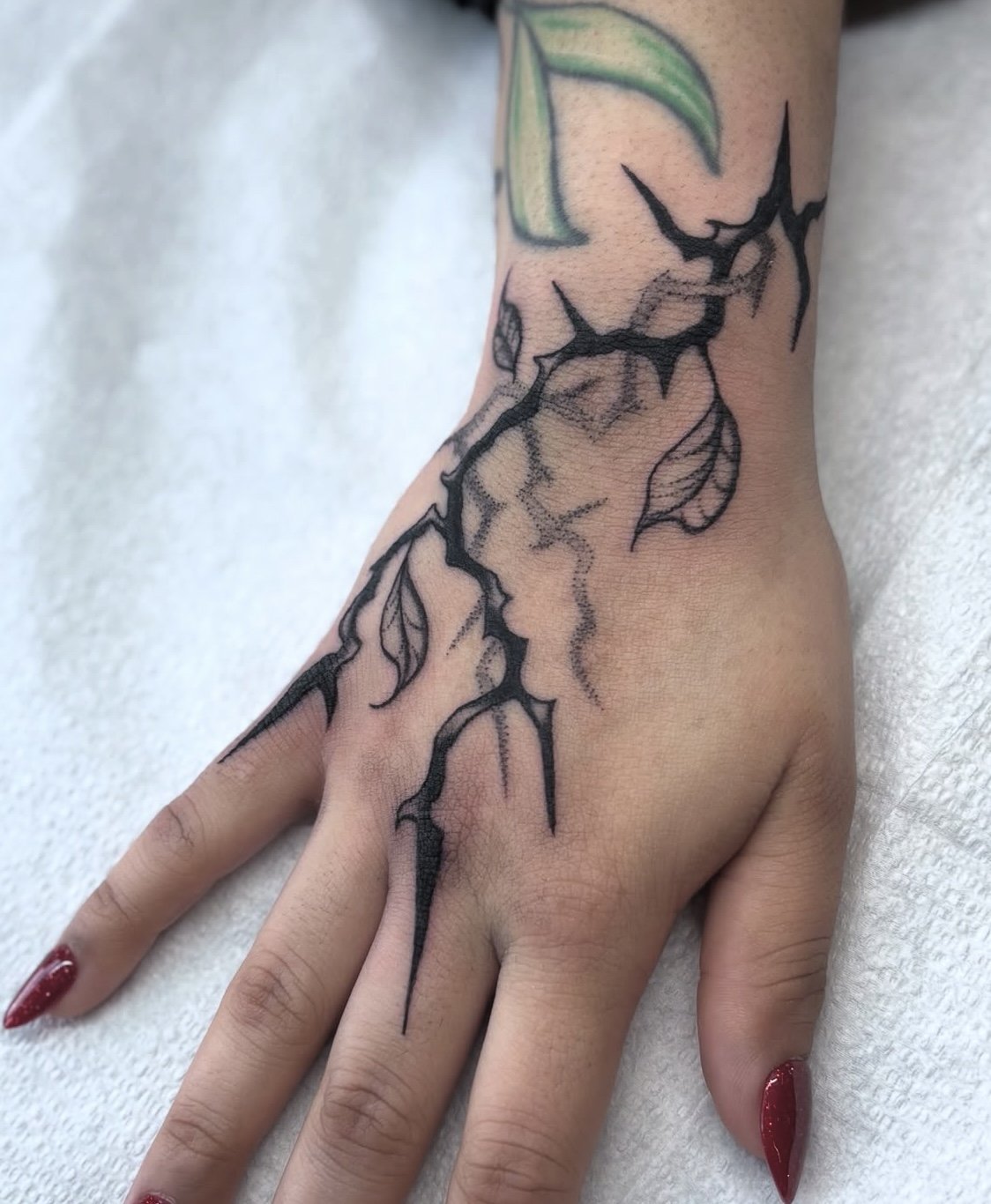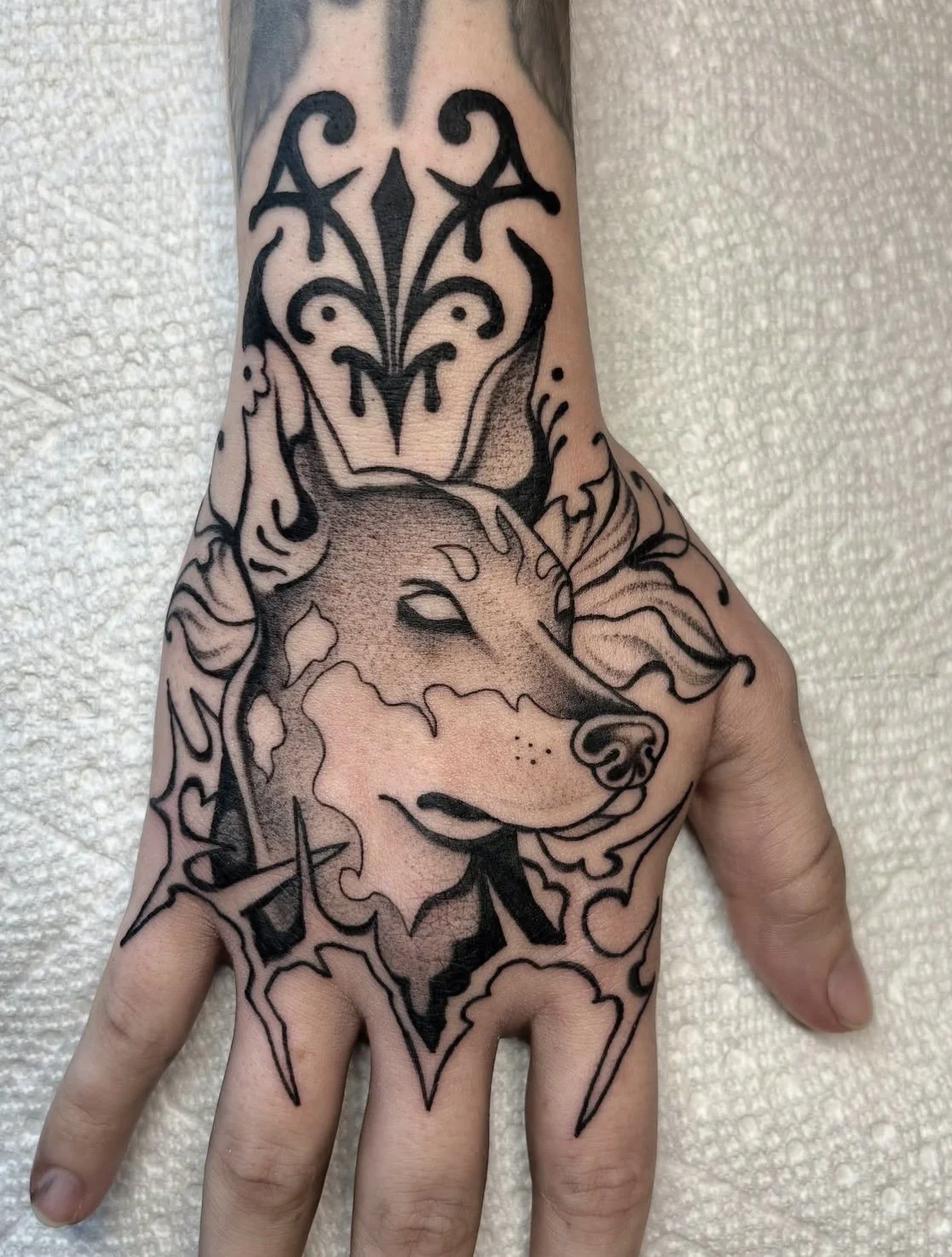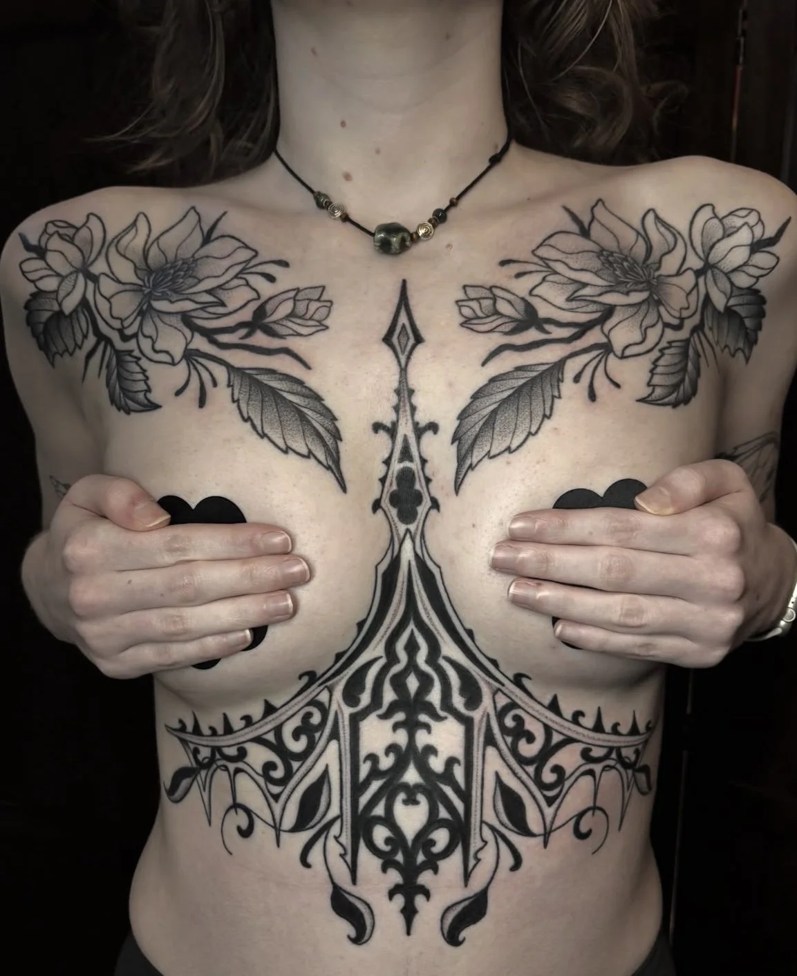 Jasmine specializes in illustrative black and grey tattoos and fine line work, with a focus on detail, contrast, and custom composition. Her favorite subject matter includes gothic and medieval imagery, botanicals, surrealism, and anime-inspired designs.